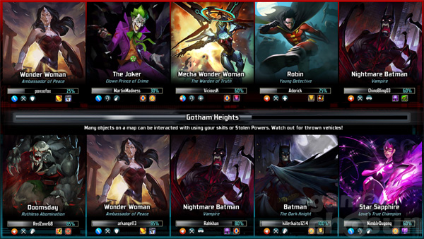 DC코믹스 영웅을 직접 선택하여 즐기는 게임인만큼 캐릭터만큼은 다른 MOBA 게임을 압도한다고 볼 수 있다. 같은 챔피언이더라도 멀티버스라는 독특한 세계관 덕에 다양한 형태로 나와 더욱 이목을 끈다. 배트맨은 배트맨과 나이트메어배트맨, 개스라이트배트맨으로 나뉘어져 있고, 원더우먼은 원더우먼과 메카원더우먼으로 나뉘어 있는 등 다양한 챔피언이 있어 주목을 끈다.