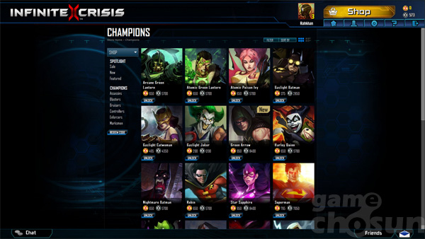 많은 DC 코믹스 챔피언이 있지만, 기본으로 플레이할 수 있는 제한되어 있으며, 게임 내 머니로 구매를 해야만 플레이가 가능하다.