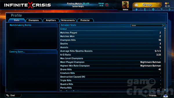 프로필에서는 자신이 소유한 챔피언과 강화제, 달성과제 등 다양한 정보를 확인할 수 있다. 한가지 특이한 점은 챔피언마다 레벨이 상승한다는 점. 현재 레벨이 올라도 달라지는 점은 없어보인다. 현재 자기가 플레이한 횟수, 이긴 횟수, KDA등등 다양한 정보를 세부적으로 확인할 수 있다.
