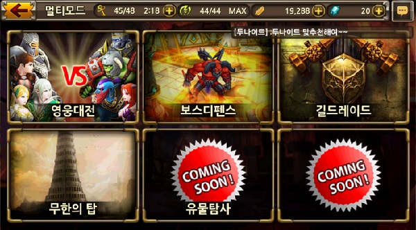 멀티모드에는 영웅대전, 보스디펜스, 길드레이드, 무한의탑이 있다. 영웅대전은 다른 유저의 정예파티와 나의 정예파티가 대결을 펼치는 다소 흥미로운 부분이기는 하나, 대전 방식이 랜덤이라서 레벨밸런스가 맞지 않아 레벨이 낮은 유저에게는 불리한 점이 있다.