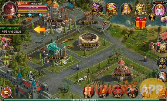 하단과 우측의 메뉴까지 있으니 원하는 메뉴를 찾는 것은 어렵지 않을 것이다. 성 내의 건물들은 각각 중요한 역할을 하는데 업그레이드를 꾸준히 하지 않는다면 제대로 된 효과를 볼 수 없을 것이다.