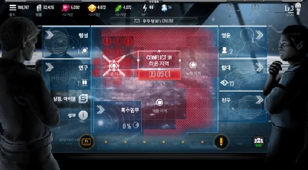우주영웅전이 우주를 소재로 한 게임이기 때문인지 UI자체도 우주선 내부의 느낌이 강하다. 메인 UI의 경우 표시되지 않은 정보가 더 많아 초반에는 눌러봐야만 뭐가 뭔지 알 수 있다.