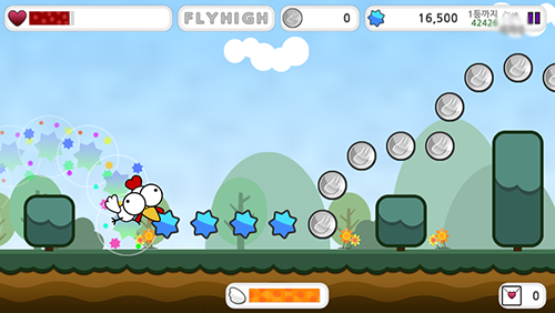 <날아라 꼬꼬>는 기존의 러닝 장르에 플라잉 액션을 추가했다. 즉, 점프 버튼 외에도 점프를 길게 누르면 체공시간이 길어져 하늘을 날 수 있게 된다는 것. 확실히 흔히 봐오던 러닝 게임들과는 차별화된 요소다. 점프의 강약을 조절해 비행을 컨트롤 할 수 있는데 장애물을 피하거나 코인이나 점수 심볼을 획득하는 재미가 쏠쏠하다.