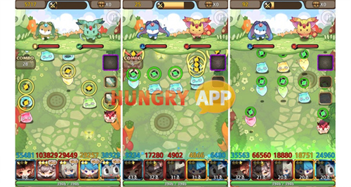 이번에는 <크레이지몬>의 게임 방식에 대해 알아보자. 아래 이미지 화면처럼 용사(플레이어)의 동료들을 향해서 보스 몬스터의 지시 아래 수많은 몬스터들이 밀려온다. 이 몬스터들에는 일정한 주기로 변하는 원 모양의 표식이 있으며, 빨강/노랑/초록색으로 변한다. 용사(플레이어)는 정확한 타이밍을 노려 초록색 혹은 노란색으로 표기된 몬스터들을 한번에 많이 슬라이드 하여 높은 점수와 데미지를 보스 몬스터에게 타격하는 방식이다.