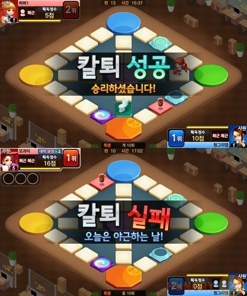 네모난 윷판. 하지만 <인생역전윷놀이>를 하는 순간부터는 윷판이 곧 일과와 같다. 골인 지점으로 빨리 가게 될수록 칼퇴를 하기 수월해지고, 돌아갈수록 야근을 해야 된다는 사실! 직급이 높아도 봐주지 않는다. 그래서 종종 과장이 야근하고 평사원은 일찍 퇴근을 하게 되는 재밌는 상황이 벌어지게 된다.
