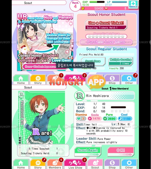 일명 뽑기 머신이라 불리는 스카우트를 통해 유망주(?) 아이돌을 영입해야 한다. 이들과 함께 '스쿨 아이돌 그룹'을 결성, 열혈 홍보를 병행해야 한다. 참고로 스쿨 아이돌 그룹은 앞서 언급한 팀의 개념이다.