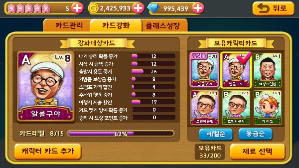각각 다양한 버전의 캐릭터 카드가 준비되어 있어 수집욕을 자극한다. 보유한 캐릭터 카드는 더욱 높은 등급의 카드로 업그레이드 할 수 있으며 높은 등급으로 갈수록 능력치가 상승해 게임을 유리하게 이끌어 나갈 수 있다.