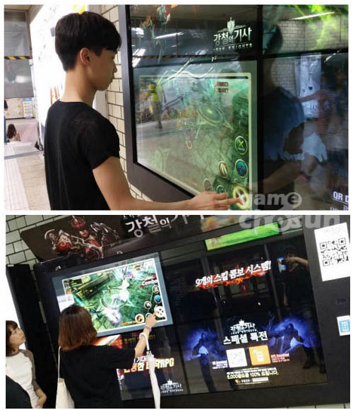 94인치 대형 화면에서 펼쳐지는 신작 RPG '강철의 기사'를 직접 플레이하기 위해 사람들이 삼삼오오 모여 든다. 화려하거나 아기자기한 부가적인 소품은 없다. 순수한 '제품' 그 자체만으로 지하철을 이용하는 사람들의 발길을 붙잡았다.