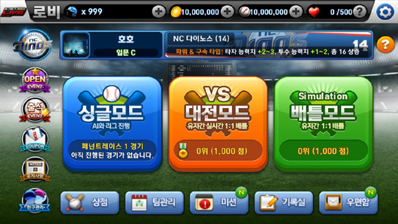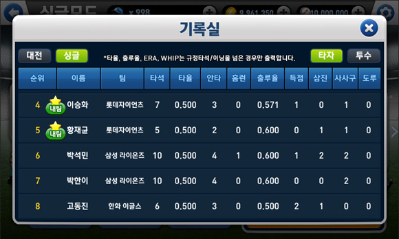거기다 1:1 실시간 대전모드 지원으로 다른 유저 또는 친구와의 대결이 가능하며 이는 PC 야구 게임을 뛰어넘는 짜릿한 야구 게임의 진수를 맛볼 수 있게 한다.