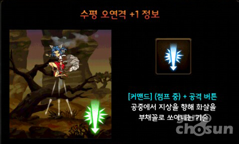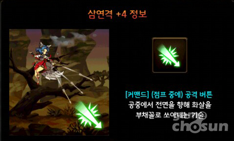 점프 상태에서 아래 방향키와 공격 버튼을 동시에 누르면 발동된다. 스킬 사용 시 보고 있는 방향을 향해 약간 이동하며 활을 발사하는 데, 이 방향을 맞추는 것이 쉽지 않다.