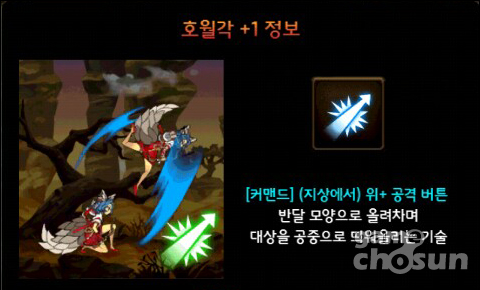 '호월각'은 궁사의 띄우기 스킬로 방향키를 위 버튼과 공격 버튼을 함께 누르면 발동된다. 궁사에겐 이렇다할 공중 콤보가 없기 때문에 공격용이라고 하기 보다는 몬스터들에게 둘러쌓였을 때 탈출용으로 애용된다.