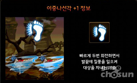 '이중나선각'은 회전하면서 적들을 향해 두 번의 발길질을 가하는 스킬이다. 넉백 효과와 다운되어 있는 적들에게도 피해를 입힐 수 있기 때문에 몬스터 몰이용으로 사용하면 좋다.