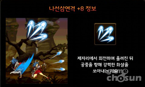 '나선삼연격'은 궁수의 주력 스킬로 적을 띄우는 동시에 적을 관통하며 다단히트 피해를 입힌다. 적의 진영을 무너트리는 데도 좋고 몰이하는 데도 좋은 완소 스킬이다.