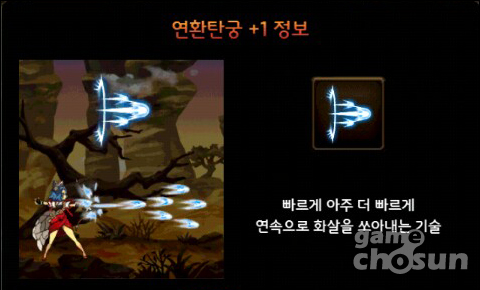 '연환탄궁'은 보스와 1:1 대치 시 사용하면 가장 큰 효과를 볼 수 있는 스킬이다. 적을 관통하지 못한다는 단점이 있긴 하지만 단일 개체를 공격할 때는 이만한 스킬이 없다.