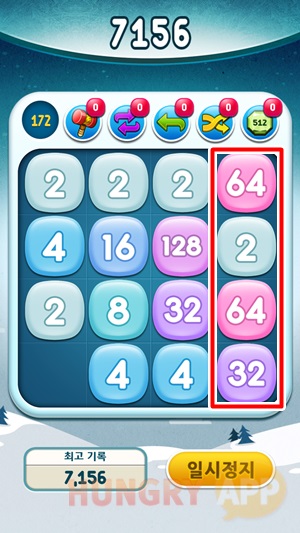 위 그림을 보면 우측으로 높은 숫자가 모여있다. 하나의 방향을 정하고 우측으로 모을 거라면 절대로 우측에서 좌측으로는 스와이프 하지 않는 것이 비법이다. 그 외 방향 좌측에서 우측, 위에서 아래, 아래에서 위로는 마음껏 움직여도 좋다. 이런 방법으로 게임을 진행한다면 충분히 초보자도 고득점을 노릴 수 있다.