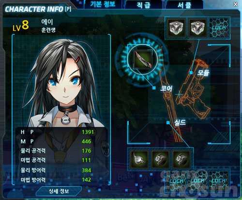 또 무기 개념의 '코어'와 '모듈'에는 '적합도'라는 것이 존재해 자신의 캐릭터에게 어떠한 아이템이 더 맞는지를 수치적으로 비교할 수 있어 편리하다. 다만 '실드'는 슬롯이 6개인데다 코어/모듈과는 달리 적합도가 표시되지 않아 선택이 매우 어려웠다.