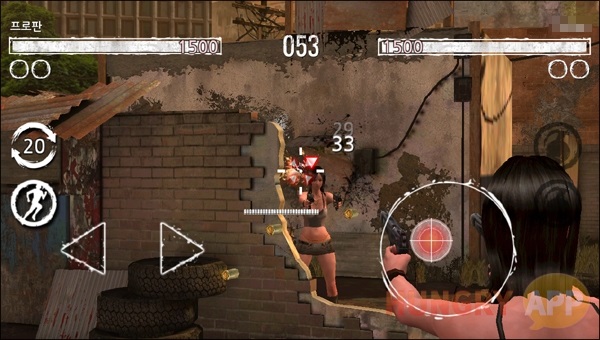 <건맨 더 듀얼>의 조작은 매우 간단하다. 좌, 우 버튼을 터치해서 캐릭터를 이동시키고, 화면 오른쪽을 드래그해서 상대를 조준하고 공격한다. 이동은 좌, 우 버튼을 터치하면 캐릭터가 지정된 경로를 따라 자동으로 이동하는 구조다. 홍보 영상에서 보여준 캐릭터의 화려한 몸놀림도 버튼을 한 번 터치하는 것으로 재현이 가능하다.