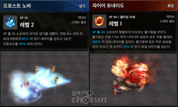 체인 라이트닝은 최대 전방의 적 8명에게 번개 대미지를 입히는 스킬로 한 번에 다수의 몬스터를 사냥하는 몰이사냥에 적합하고, 프로스트 노바를 먼저 사용해 상대를 느리게 한 뒤 사용하면 적이 다가오기 전에 처리하는 것이 가능하다.