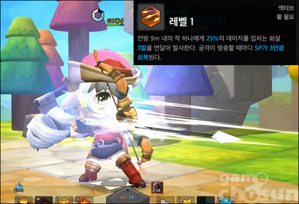기본 체력과 방어 수치가 낮은 편이기에, 몬스터들에게 받는 피해량이 큰 편인데, 이런 단점을 보완하기 위해 몬스터와 거리를 벌리는 ‘이베이젼 샷’과 같은 스킬도 있다. 이베이젼 샷은 순간적으로 뒤로 물러나면서 전방의 적 최대 5명에게 대미지를 입히는 스킬이다. 이외에도 전방의 적들에게 냉기 화살을 발사해 이동속도를 50%만큼 감소시키는 ‘아이스 애로우’로 생존력을 더욱 높일 수 있다.