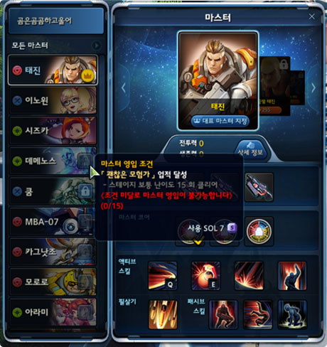 먼저 기본적으로 주어지는 마스터 이외에는 마스터를 영입해야 한다. 마스터 영입조건을 달성하면, 원하는 마스터를 획득 할 수 있다. 우선 개인의 플레이 스타일에 맞추어 원하는 마스터를 획득해 보자.