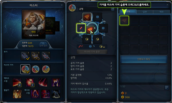 각 마스터는 3종류의 마스터 기어를 가지고 있다. 6개의 기어 슬롯을 가진 마스터 기어는 공격/방어/보조 슬롯의 비율에 따라 종류가 결정된다. 인벤토리에 있는 기어를 마스터기어에 장착할 수 있다. 기어 시스템은 계정 기반이므로 자신이 키우는 마스터 중심으로 적절히 배분해야 한다. 또한 마스터 기어의 경우 사용 횟수에 따라 그 기능(에너지)이 감소하므로 중간중간 체크하여 충전해야 한다.
