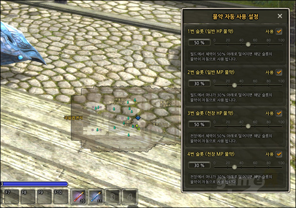 물약 자동 사용 설정 시스템은 말 그대로 물약을 자동으로 먹어주는 시스템이다. 마탄사의 경우 멀리서 적을 공격해 다가오기도 전에 적을 처치하기 때문에 체력 물약을 먹을 일은 별로 없었지만, 스킬을 많이 사용하다보니 마나가 상당히 부족했다. 이때 일일히 마나 물약을 클릭하는 것이 아니라 우측 하단의 슬롯에 올려두면 자동으로 사용하게 된다. 무작정 사용하는 것이 아니라 체력과 마나가 일정 수준 이하로 내려갈 때에만 사용하기 때문에 낭비도 상당히 줄어든다.