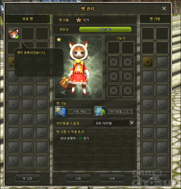 펫 시스템은 말그대로 소환수 시스템으로 사냥에 직접적으로 영향을 주진 않지만, 능력치를 올려주며, 아이템이나 회복구슬 등을 먹어주는 역할을 대신해준다. 또한, 부족한 가방 칸의 부담을 줄여주기 위해 펫 또한 가방을 가지고 있으며, 펫 가방에 넣어놓은 아이템을 팔고 오게 시킬 수도 있다.
