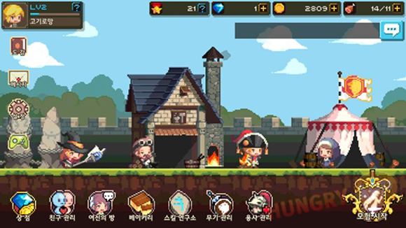 마을에 들어서면 가장 먼저 눈에 들어오는 것은 도트로 구현된 아기자기한 캐릭터들과 마을의 풍경들이다. 모닥불이 일렁이거나, 막사 위에 펄럭이는 깃발도 모두 도트로 구현되어있다. 또한, UI에 등장하는 모든 아이콘과 숫자들 역시 모두 도트로 되어있어 어색하지 않고 잘 정돈된 느낌을 받는다.