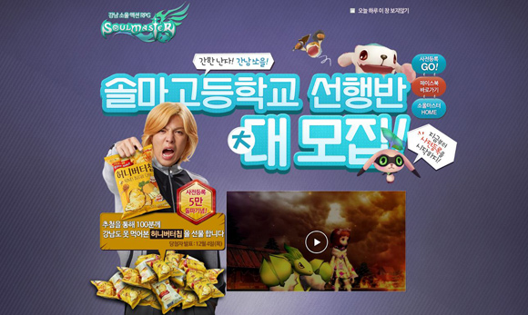 특히 강남의 어눌한 발음에 포인트를 맞춰 ‘간한 난자! 간남 쏘울’ 이라는 다소 독특한 슬로건을 내밀며 젊은층의 폭발적인 지지를 받고 있다. 또한 품귀현상을 빚으며 불황에도 대세로 떠오른 ‘허니버터칩’을 선물하는 이벤트를 선보이고, 사전등록을 ‘솔마고등학교’ 선행반 大모집으로 표현하는 등 톡톡 튀고 엣지 있는 발상을 선보이고 있다. ‘강남 야동’ ‘강남 받아쓰기’ 등 상상력을 자극하는 홍보영상도 유저들의 이목을 끌고 있다는 후문이다.