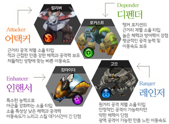 소울은 총 4가지 타입으로 구분이 되는데, 저돌적 성향과 빠른 이동속도가 돋보이는 어택커, 높은체력과 방어력이 강점인 디펜더, 특수한 능력으로 아군을 강화하는 능력을 가진 인핸서, 안정적인 공격을 선보이는 레인저 등이 있다.