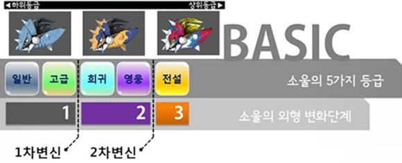 소울은 일반•고급•희귀•영웅•전설 총 5가지 등급으로 나누어져 있으며, 일정 단계를 기준으로 외형이 변화한다. 획득한 소울은 소울 슬롯에 장착 후 던전을 공략하며 레벨업을 시킬 수 있고, 이렇게 성장시킨 소울은 강화나 진화 시스템을 이용하여 더욱 강하게 성장시킬 수 있다.