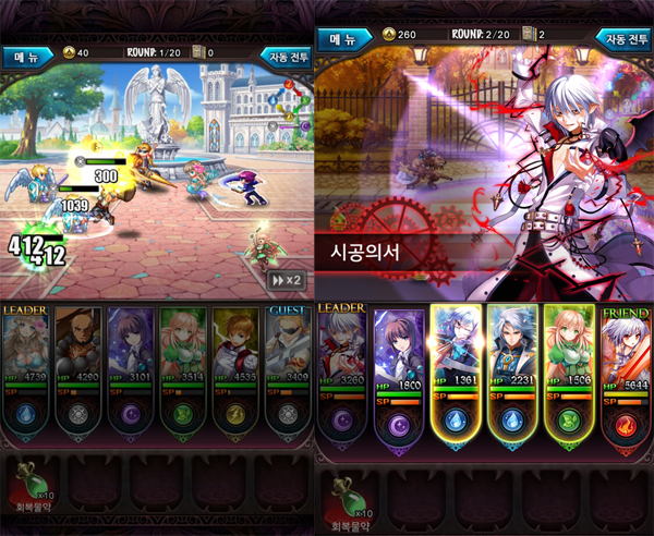 특히 모바일 기기에 최적화시킨 조작 방식인 터치와 슬라이드를 이용해 전투를 진행할 수 있다. 화면을 좌에서 우방향으로 슬라이드하면 파티원 전체의 일반 공격이 가능하다.