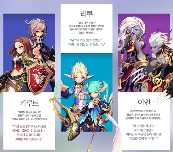 '엘로아'에는 새로운 세상을 여는 자 '카루트'와 빛의 요정 '리루', 선택을 받은 자 '아인' 등 기본적으로 3가지 종족이 존재한다.