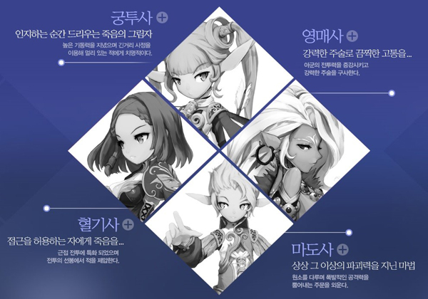 근접 전투에서 빠르고 강한 공격으로 적을 제압하는 혈기사, 마법주문으로 폭발적인 공격력을 뿜어내는 마도사, 원거리에서 치명적인 공격을 가하는 궁투사, 아군의 전투력을 높이면서 강력한 주술을 구사하는 영매사로 나뉜다. 각 직업마다 3가지 플레이 스타일이 별로도 존재한다.