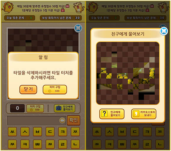 <뭘까요? for Kakao>의 조합이 참 독특하다. 빠른 눈썰미로 풀어야 하는 그림 맞추기와 해답의 초성을 빠르게 찾아 단어를 유추해 내는 순발력이 필요한 게임이다.