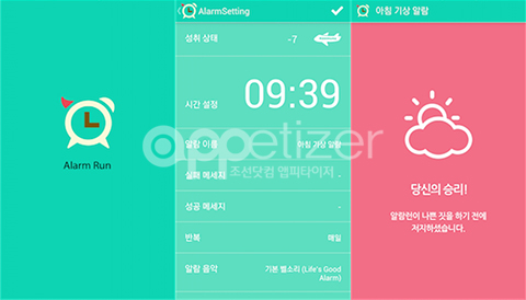 '알람런'은 설정을 통해 계획한 시간에 일어나지 않으면 페이스북 또는 트위터에 정해놓은 멘트가 자동으로 포스팅되는 애플리케이션이다. 일찍 일어나기로 다짐한 결심을 지키기 위해 주변 사람의 도움을 받을 수 있고, 독특한 멘트가 공개적으로 올라가는 것을 전제로 친구 또는 연인과 내기를 하는 것도 가능하다. SNS 공개 설정 또는 자동 문자 발송을 통해 매일 정기적인 아침 약속이 있는 모임에서는 개개인의 기상 여부를 자동으로 확인할 수 있는 것도 '알람런'만의 유용한 기능이다.