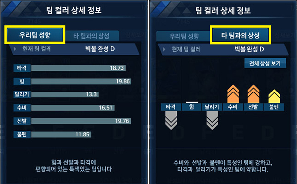 한 예로 ‘힘’과 ‘선발’이 강한 팀의 경우, ‘빅볼 완성D’라는 팀컬러가 발동하는데, 이 팀컬러는 수비나 선발, 불펜이 강점인 팀을 만나면 본래 능력보다 더 강한 모습으로 경기에 임한다.