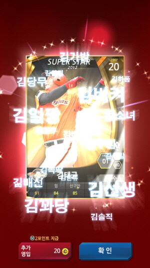 스카우트를 통해 선수카드를 획득하면, 선수의 개성을 살린 연출이 등장한다. 예를 들어 삼성 박석민 선수를 획득하면 ‘트리플 악셀’이 뜨고, 별명이 ‘꽃범호’인 이범호 선수카드가 등장하면 꽃이 만발한다. 선수카드 하나, 하나 야구 감성을 담아 카드의 가치와 획득의 재미를 올렸다.
