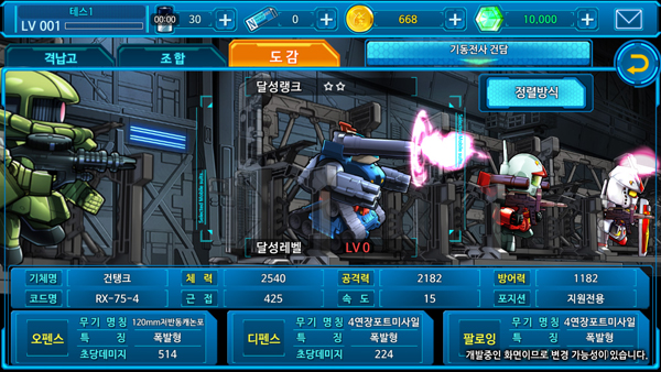 "SD건담슈터는 수십 종의 건담 기체를 수집하고 성장시키며 최강의 소대를 만들어 나가는 게임이다."