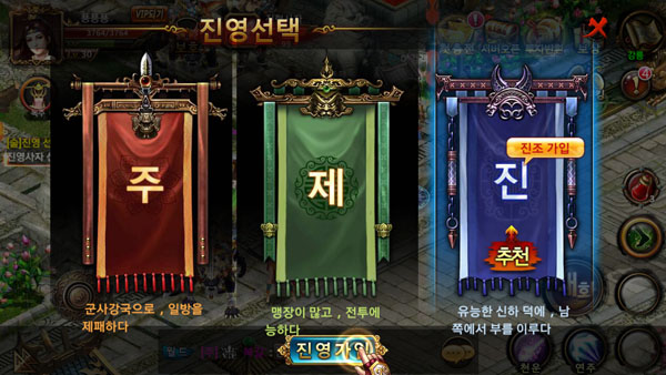 30레벨이 되면 진, 주, 제 진영 중 하나를 선택하게 되는데 이때부터 캐릭터는 진영의 구성원이 되어 다른 진영과 영원한 분쟁상태가 된다. 적과는 적극적으로 싸우는 것이 재미와 보상면에서 유리하며 때때로 적 진영에 잠입하거나 쓰러뜨려야하는 퀘스트가 생기니 이를 적극적으로 이용하는 것이 좋다.