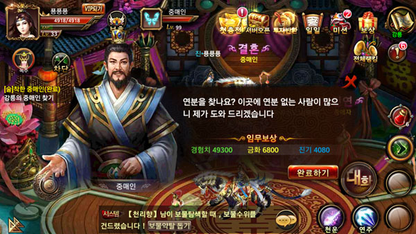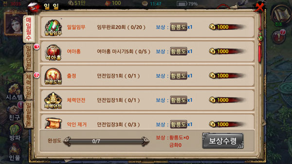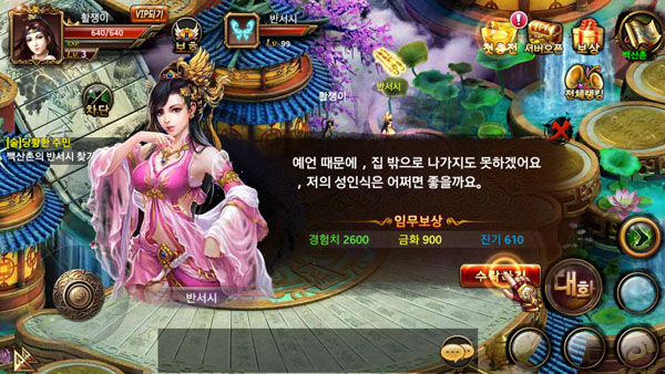스토리 진행을 중심으로 하는 메인 퀘스트는 기본이고 장비, 미인, 내공, 스킬 강화 등 다양한 강화 시스템이 있으며 일일 퀘스트 미션 등 특정시간에만 수행 가능한 퀘스트도 있다. 마음만 먹으면 하루종일 붙잡고 있어도 즐길거리가 있다는 의미다.