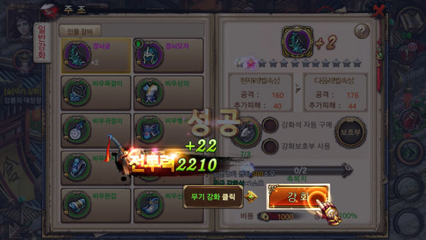게임을 진행하면 캐릭터는 다양한 방법으로 성장하게 된다. 단순히 레벨을 올리고 좋은 장비를 얻는 것 외에도 스킬 레벨, 내공을 쌓을 수 있고 '미인'이라는 동행자를 강화할 수도 있다. 모든 강화행동은 전투력과 직결되고 이를 직접 수치로 확인할 수 있어 서로간 우열을 가늠하기 용이하다.