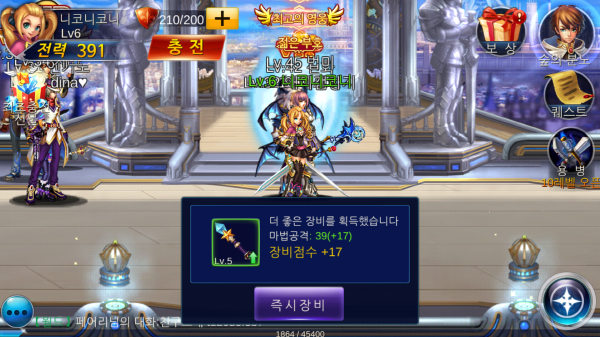 던전은 클리어할 때마다 더 어려운 단계의 던전이 열리는 구조로 던전 입구에 적정 전력이 쓰여있어 내 캐릭터가 깰 수 있을만한 던전인지 바로 파악할 수 있다. 전력이 다소 낮아도 콘트롤로 충분히 커버가 가능하지만 전체적으로 강화에 필요한 재료를 충분히 주는 편이라 45레벨이 될 때까지 전력이 부족해 노가다하는 불편함은 없다.