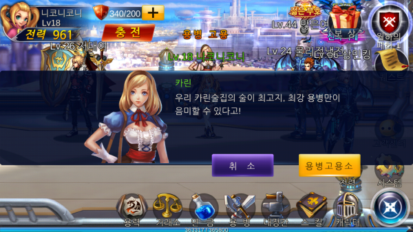 용병은 캐릭터와 함께 전장에 투입되는 NPC로 파티게임이 쉽지 않은 모바일에서 던전을 클리어하기 쉽게 도와준다. 퀘스트을 진행하다보면 자연스럽게 초급 전사 캐릭터를 받을 수 있는데 이때부터 용병육성이 가능해진다. 기본적으로 근접 공격이 특기인 전사를 받지만 마법사 계열의 용병도 존재한다.