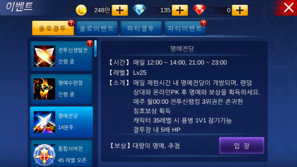 메인 콘텐츠는 단연 PVP 결투 시스템이다. 솔로결투와 파티결투로 나뉘며 결투를 위한 공간에 이동돼 한쪽이 완전히 쓰러질 때까지 싸우는 것이 기본이다. 1일 10회가 기본이고 VIP등급에 따라 더 많이 도전할 수 있는데 비록 져도 보상을 받을 수 있으니 적극 참여하는 것이 좋다.