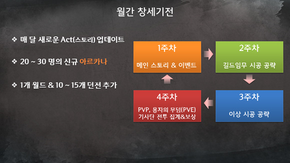 '창세기전4'는 서비스하면서 매달 1개의 '액트'를 추가할 예정이다. 소프트맥스는 이 계획을 '월간 창세기전'이라고 이름을 붙였다. 게이머가 매달 '잡지'를 하나 읽는다는 기분으로 '1개의 액트'를 즐긴다는 컨셉이다.