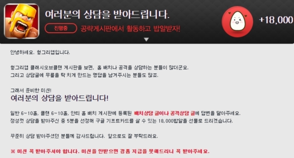현재 5,700개가 넘는 게임의 커뮤니티가 운영 중인 헝그리앱은 ‘CoC’ 외에도 ‘세븐나이츠’, ‘레이븐’, ‘베인글로리’, ‘모두의마블’, ‘영웅’, ‘애니팡2’, ‘블레이드’, ‘서머너즈워’, ‘별이되어라’, ‘캔디크러쉬사가’, ‘탑오브탱커’, ’리그오브레전드’, ‘피파온라인3’, ‘월드오브탱크’, ‘던전앤파이터’, ‘서든어택’, ‘메이플스토리’, ‘이터널시티3’, ‘풋볼매니저 온라인’, ’아제라’ 등의 인기 게임은 물론 '창세기전4', ‘뮤오리진’, '공각기동대 온라인', '하스스톤', ‘히어로즈오브더스톰’, ‘파이러츠’ 등 기대작의 공략 정보와 DB를 준비하는 등, 유저들에게 유익한 정보를 전달하고 재미있게 머물다 갈 수 있도록 편의를 제공하고 있다.