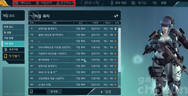 이러한 스토리 관련 콘텐츠는 추후 등장할 것으로 예상된다. 게임 로비의 상단에 위치한 에피소드와 비밀조직, 은신처수사 모드가 준비중임을 알 수 있다.