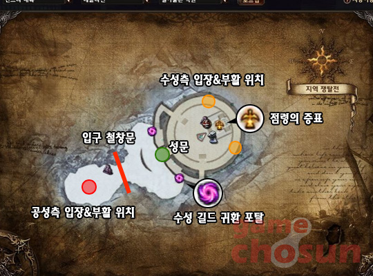 이규철 PD: 모든 지역 쟁탈전 필드의 구성은 같은 구조로 되어 있는데, 쟁탈전 시작과 함께 철창문이 개방되고 공성 길드들의 진입이 가능해집니다. 공성측은 요새의 성문을 파괴하고 내부로 진입해 성물까지 점령하면 공성에 성공하는 단순한 구조이며 반대로 수성 길드는 지형과 장치를 이용해 적의 공격을 저지하고 성물을 지켜내면 됩니다.