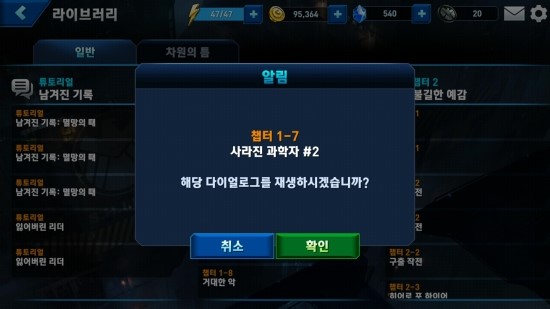 보상(일반 임무에서 하나의 스테이지를 공략했을 경우)으로는 골드 이외에도 캐릭터의 장비 강화에 필요한 재료가 주어지며 한 챕터의 스테이지를 모두 공략했을 경우에 해당 챕터의 '정예 임무'가 열리게 된다. 정예 스테이지에서는 새로운 영웅의 획득에 필요한 생체데이터와 영웅을 진급시킬 수 있는 생체데이터를 얻을 수 있다.